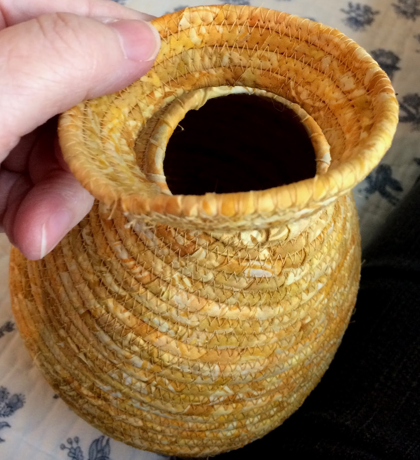I have made a second pot using strips of fabric wrapped around clothesline. I learned this technique in the book, Sewing Pottery by Machine. I have discovered two things.